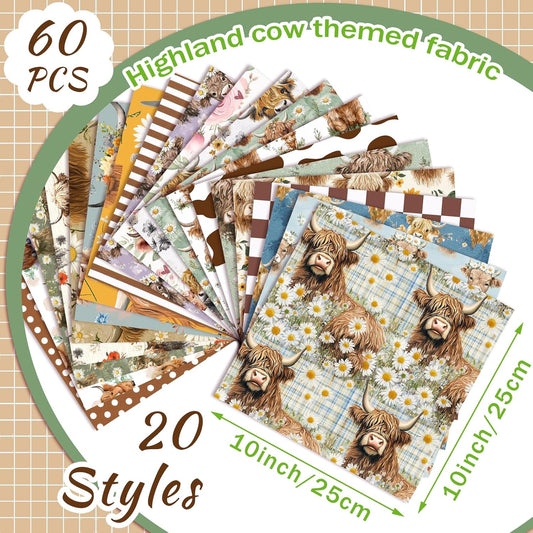 Ganeen 60 Pcs 10 x 10 Inch Highland Cow Quilting Fabric Squares Vintage Highland Cow Fat Patchwork Precut Strips Retro Multicolor Fabric Bundles for Holiday DIY Craft Sewing Quilt Material Handmade