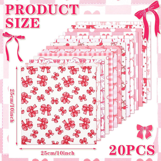 Ganeen 60 Pcs 10 x 10 Inch Pink Bows Quilting Fabric Squares Coquette Pink Bow Fat Patchwork Precut Strips Plaid Dot Heart Coquette Fabric Bundles for Holidays DIY Craft Sewing Handmade Material Gifts