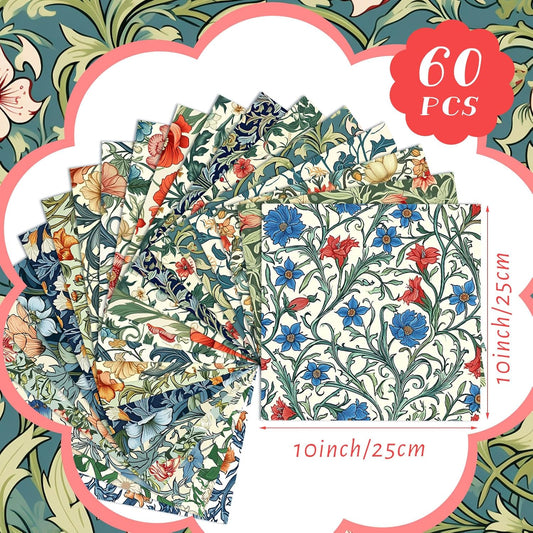 Ganeen 60 Pcs 10 x 10 Inch William Morris Floral Quilting Fabric Squares Vintage Floral Fat Patchwork Precut Strips Retro Multicolor Fabric Bundles for Holiday DIY Craft Sewing Quilt Material Handmade