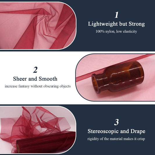 Organza Tulle Fabric Rolls, Crystal Organza 12" by 50 Yards (150 ft) Sheer Nylon Silky Shiny Netting Spool Bolt for DIY Craft Table Runner Wedding Baby Shower Party Decor (Burgundy)