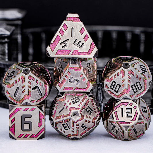 Metal DND Sci-fi Dice Set 7PCS Stripe Polyhedral Dice for Dungeons Dragons RPG Role Playing Game, Glitter D and D Dice with Gift Box D6 D8 D10 D12 D20 (Grey&Purple Red)