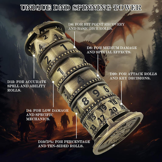 DND Dice Spinner Tower Set - Unique D4 D6 D8 D10 D10% D12 D20 All in One D&D Metal Dice - Cool Role Playing Gifts for Dungeons and Dragons TRPG MTG Games Lover Player (Tower-Ancient Bronze)