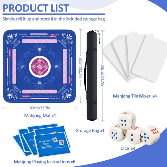Mahjong Mat with Rules for Table with 6 Mahjong Playing Instructions,4 Mahjong Tile Mixer,4 Dice & Carrying Bag,Non-Slip and Silent Travel Mahjong Set for Mahjong/Poker/Board Games/Card Games/Dominoes