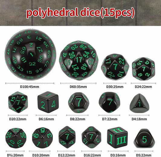 CiaraQ DND Polyhedral Dice Set (15pcs) D4-D100 Game Dice with Dice Bag for Dungeons and Dragons Role Playing Table Games (Black & Green)