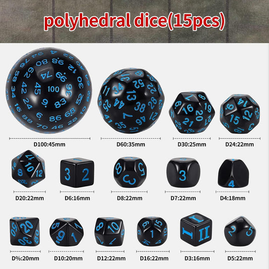 CiaraQ DND Polyhedral Dice Set (15pcs) D4-D100 Game Dice with Dice Bag for Dungeons and Dragons Role Playing Table Games (Black & Blue)