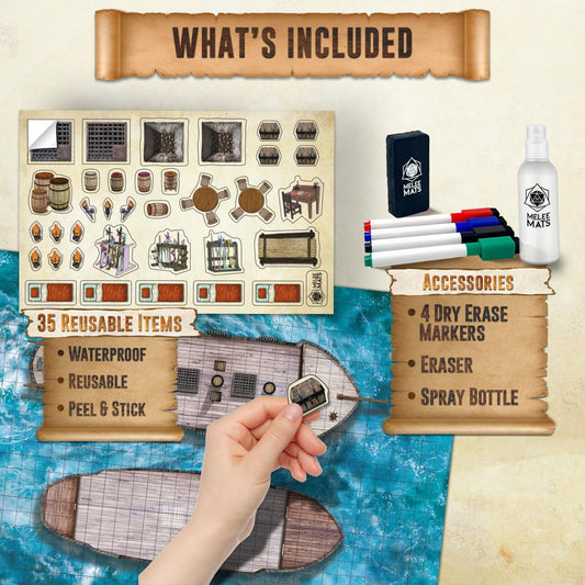 Melee Mats DND Map Starter Kit - 22” x 26" Double Sided, Wet/Dry Erase Battle Terrain Grid - Ultimate Tabletop Board Gaming Experience with Accessories