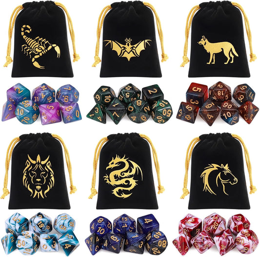 CiaraQ DND Polyhedral Dice Set (42pcs) with 6 Gold Pattern Drawstring Pouches for Dungeons and Dragons RPG MTG Table Games. 6 X 7 Double-Colors Dice Sets (D4 D6 D8 D10 D% D12 D20)