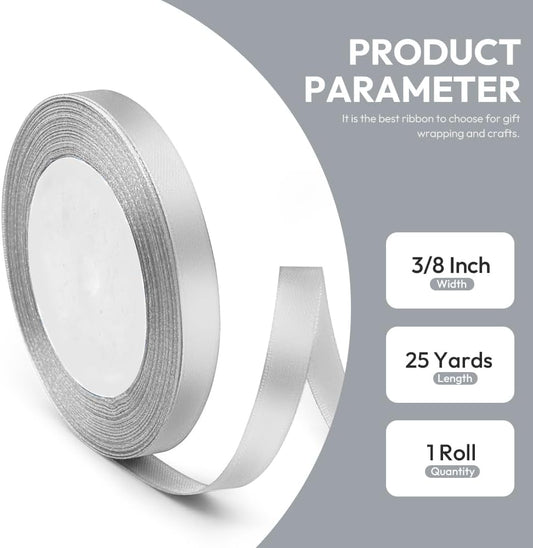 3/8" x 25 Yards Satin Ribbon, Silver Silk Ribbon Ideal for Gift Wrapping, Floral Bouquets, Crafts, Wedding Party Decorations, Christmas and Sewing Projects