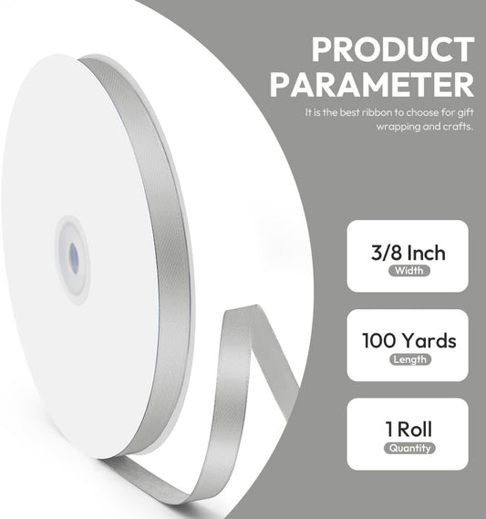 3/8" x 100 Yards Satin Ribbon - Silver Silk Ribbon with Spool - Ideal for Gift Wrapping, Floral Bouquets, Crafts, Wedding Party Decorations, Christmas and Sewing Projects