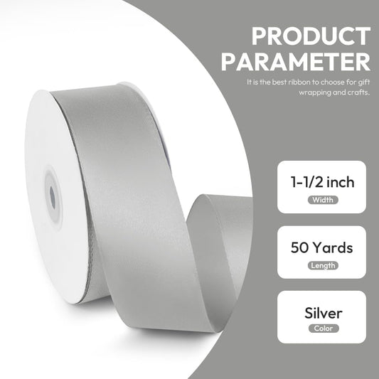 1-1/2" x 50 Yards Satin Ribbon - Silver Silk Ribbon with Spool - Ideal for Gift Wrapping, Floral Bouquets, Crafts, Wedding Party Decorations, Christmas and Sewing Projects