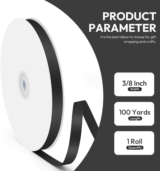 Satin Ribbon, 3/8" x 100 Yards, Black, Gift Bow, Silk, for Gift Wrapping, Flower Bouquets, Crafts, Wedding Decorations, Indoor/Outdoor