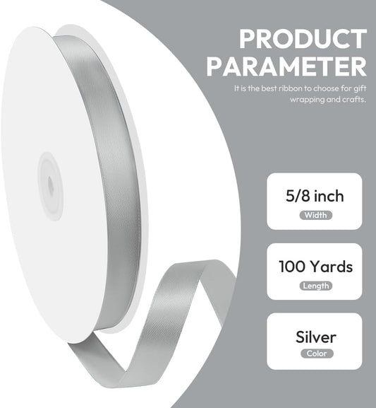 5/8" x 100 Yards Satin Ribbon - Silver Silk Ribbon with Spool - Ideal for Gift Wrapping, Floral Bouquets, Crafts, Wedding Party Decorations, Christmas and Sewing Projects