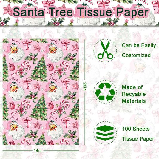 100 Sheets Pink Santa Tissue Paper, Santa Claus Xmas Tree Berries Bell Patterns Decorative Art Paper for Winter Home Party DIY Crafts Christmas Party Supplies, 13.8 x 19.7 Inch