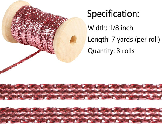 Rose Gold Thin Ribbon 1/8 inch Metallic Braided Double Faced Ribbons Curling Ribbons for Balloon String Crafts Gift Wrapping Party Wedding Christmas Ornaments Decoration 7 Yard x 3 Rolls