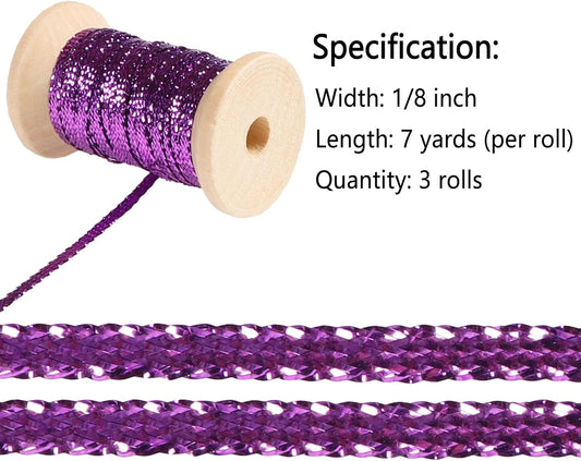 Purple Thin Ribbon 1/8 inch Metallic Braided Double Faced Ribbons Curling Ribbons for Balloon String Crafts Gift Wrapping Party Wedding Christmas Ornaments Decoration 7 Yard x 3 Rolls