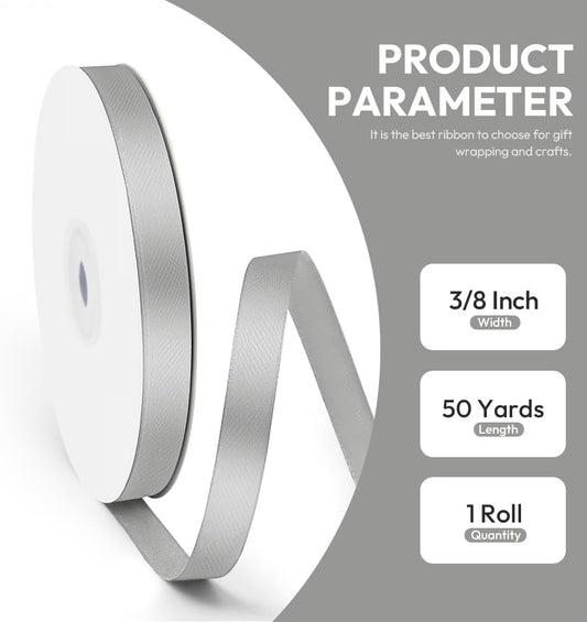 3/8" x 50 Yards Satin Ribbon - Silver Silk Ribbon with Spool - Ideal for Gift Wrapping, Floral Bouquets, Crafts, Wedding Party Decorations, Christmas and Sewing Projects