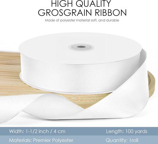 100 Yards 1.5 inch Grosgrain Ribbon, Solid Color Fabric Ribbon Perfect for Gift Wrapping, Wedding, Handmade Bows, Floral Bouquets and Party Decoration(White)