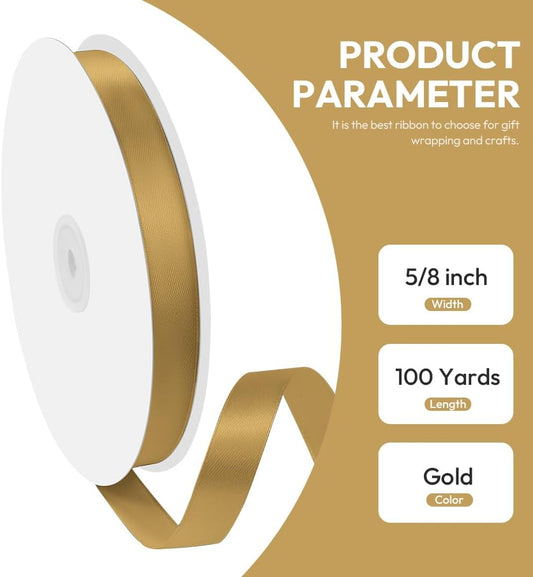 5/8" x 100 Yards Satin Ribbon - Gold Silk Ribbon with Spool - Ideal for Gift Wrapping, Floral Bouquets, Crafts, Wedding Party Decorations, Christmas and Sewing Projects