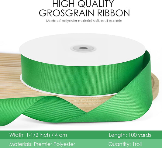 100 Yards 1.5 inch Grosgrain Ribbon, Solid Color Fabric Ribbon Perfect for Gift Wrapping, Wedding, Handmade Bows, Floral Bouquets and Party Decoration(Green)