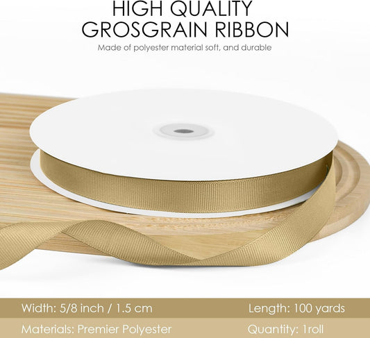 100 Yards 5/8 inch Grosgrain Ribbon, Solid Color Fabric Ribbon Perfect for Gift Wrapping, Wedding, Handmade Bows, Floral Bouquets and Party Decoration(Champagne Gold)