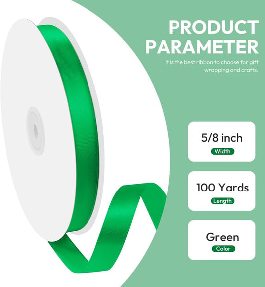 5/8" x 100 Yards Satin Ribbon - Green Silk Ribbon with Spool - Ideal for Gift Wrapping, Floral Bouquets, Crafts, Wedding Party Decorations, Christmas and Sewing Projects