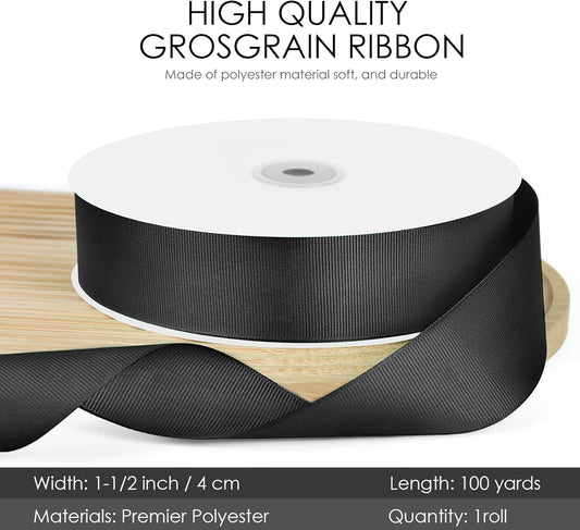 100 Yards 1.5 inch Grosgrain Ribbon, Solid Color Fabric Ribbon Perfect for Gift Wrapping, Wedding, Handmade Bows, Floral Bouquets and Party Decoration(Black)
