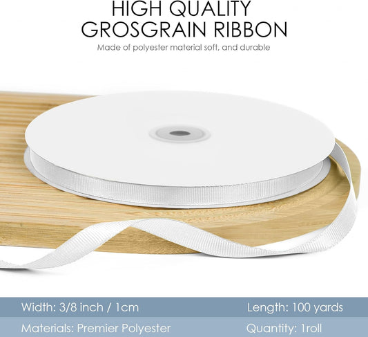 100 Yards 3/8 inch Grosgrain Ribbon, Solid Color Fabric Ribbon Perfect for Gift Wrapping, Wedding, Handmade Bows, Floral Bouquets and Party Decoration(White)