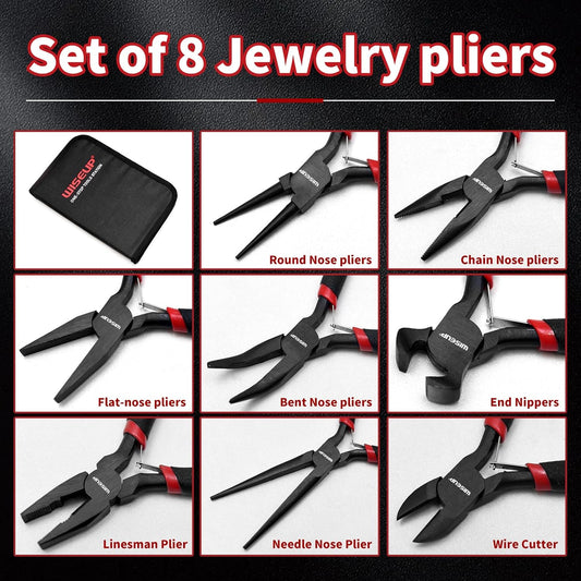 WISEUP 8-Piece Mini Pliers Set,Needle, Round, Flat, Long, Bent Nose, Diagonal, End Cutting & Linesman Pliers for Crafting, Electronics & Jewelry Making,with Pouch