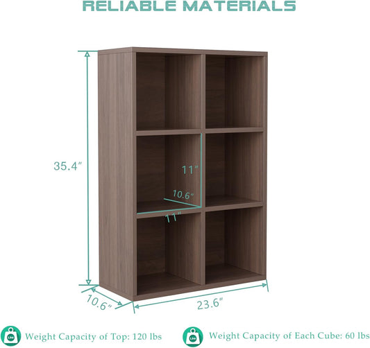 6-Cube Storage Shelf Bookcase - Wooden 3-Tier Floor Standing Open Bookshelf for Home and Office, Cuby Orgainzer, Walnut