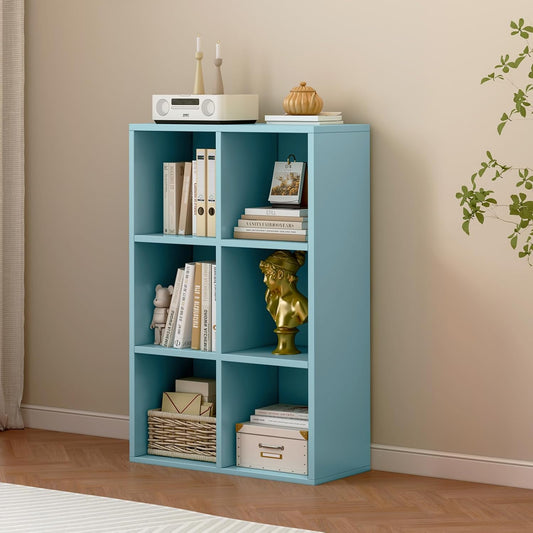6-Cube Storage Shelf Bookcase - Wooden 3-Tier Floor Standing Open Bookshelf for Home and Office, Display Cabinet, Light Blue