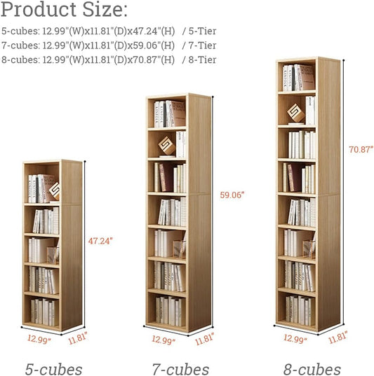 IOTXY Small Narrow Corner Bookcase - 59 Inches Tall Gap Freestanding Storage Cabinet, 7 Lattices Open Shelves Tower Rack, Cubes Bookshelf in Oak