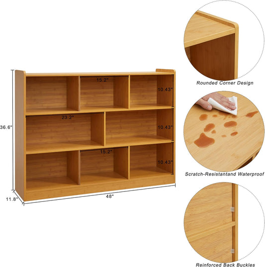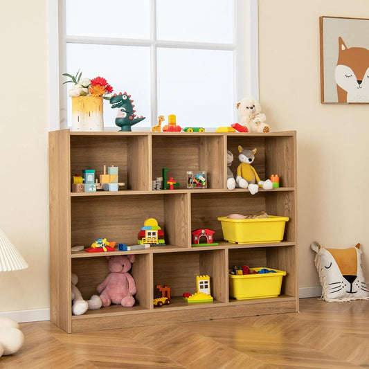 3-Tier Bookshelf, 8-Section Wooden Bookcase, Storage Organizer with Anti-Tilt Device, Modern Storage Display Cabinet for Living Room, Classroom, Kid’s Room (Natural)
