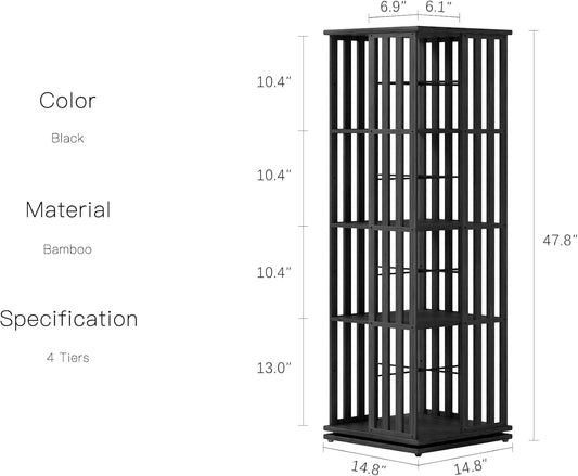 YOWOS Rotating Bookshelf Tower, 360 Display Spinning Bookcase, Bamboo Bookshelf Floor Standing Storage Rack, Wood Narrow Book Shelf Organizer for Kids&Adults (Black, 4 Tier)