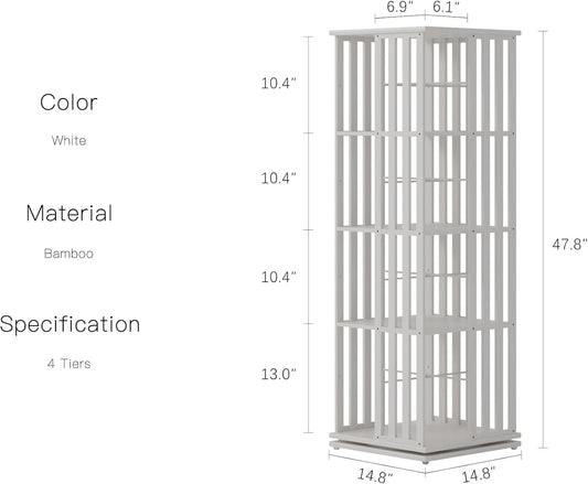 YOWOS Rotating Bookshelf Tower, 360 Display Spinning Bookcase, Bamboo Bookshelf Floor Standing Storage Rack, Wood Narrow Book Shelf Organizer for Kids&Adults (White, 4 Tier)