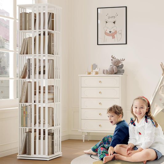 YOWOS Rotating Bookshelf Tower, 360 Display Spinning Bookcase, Bamboo Bookshelf Floor Standing Storage Rack, Wood Narrow Book Shelf Organizer for Kids&Adults (White, 6 Tier)