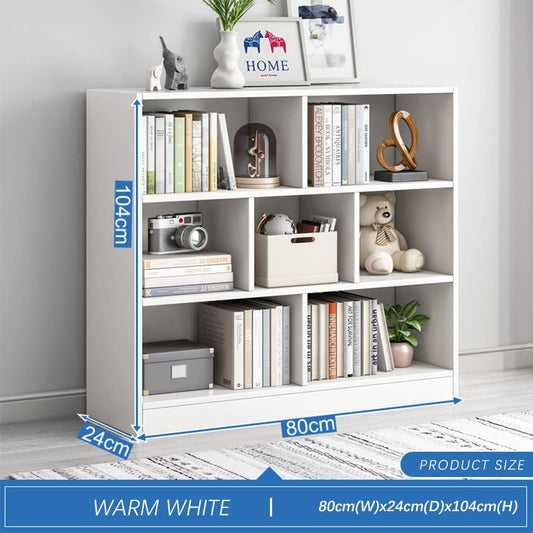 IOTXY Wooden Open Shelf Bookcase - 3-Tier Floorstanding Display Cabinet Rack with Legs, 7 Cubes Free Standing Bookshelf, Warm White