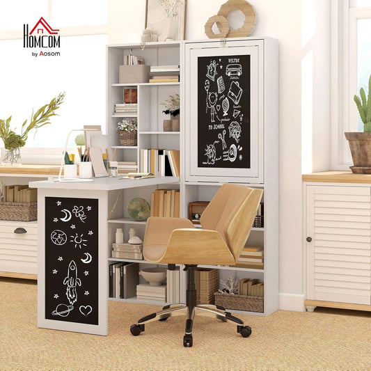 HOMCOM Fold-Out Convertible Writing Table, Wall Mount Desk Cabinet with Blackboard and Side Shelf Multi-Function Home Office Workstation, White