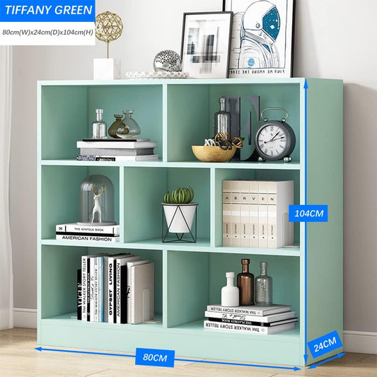 IOTXY Open Shelf Low Bookcase - Wooden 3-Tier Floor Standing Display Cabinet Organizer with Base, 7 Cubes Short Horizontal Bookshelf in Tiffany-Green