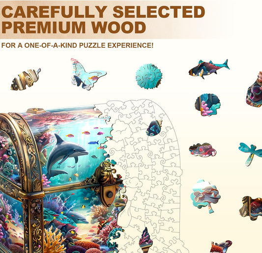 Wooden Puzzles for Adults, Treasure Chest Ocean Wooden Jigsaw Puzzle Unique Shape Animal Wood Puzzles Adult 3D Visual Effect, Birthday Gifts for Puzzle Lovers Family Games (L-13.4 * 12.9in-260pcs)