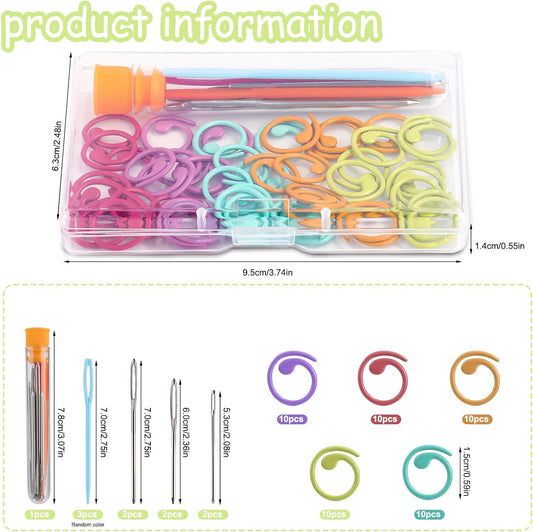 Lokunn 50 Pcs Metal Stitch Markers, 5 Color Helical-Shaped Crochet Markers Ring, 9 Pcs Large Eye Blunt Sewing Needles with Storage Box for DIY and Craft Sewing