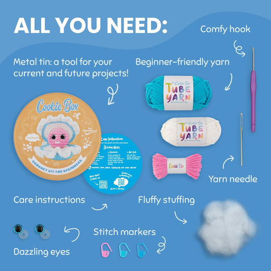 Cookie Box Crochet Kit for Beginners – Gift Set to Make Jellyfish Jenny Amigurumi Plushie – Easy DIY Crochet & Knitting Starter Kit with Video and PDF Tutorials