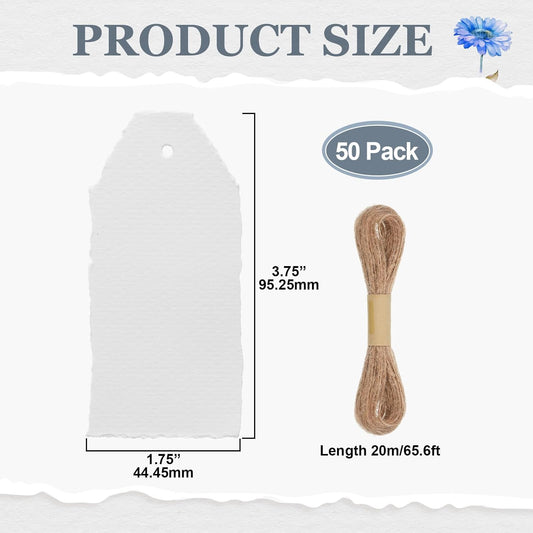 50 Pack Handmade Vintage Deckle Edge Tags with String 3.75 x 1.75 Thick 160 GSM Cotton Gift Tags with String Attached for Name Cards Place Cards Arts Crafts Gift(White)