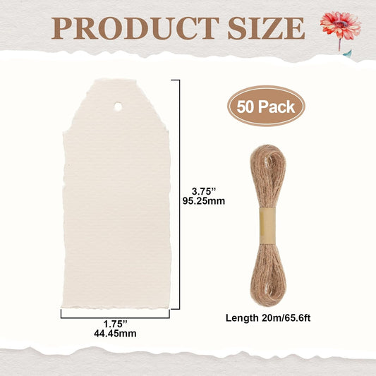 50 Pack Handmade Vintage Deckle Edge Tags with String 3.75 x 1.75 Thick 160 GSM Cotton Gift Tags with String Attached for Name Cards Place Cards Arts Crafts Gift(Vintage Beige)