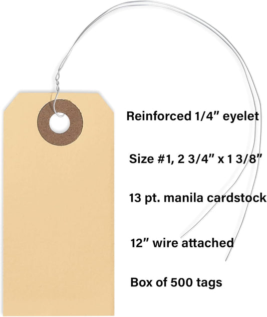 String Tags with Wire Attached- #1, 2 3/4” x 1 3/8”, Box of 500 Blank Shipping Tags with Wire and Reinforced Hole, Wired Labeling Tags