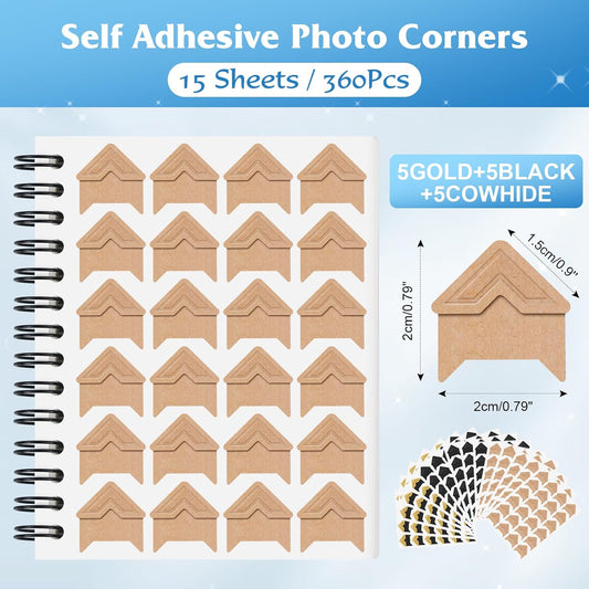 GOONAVI 15 Sheets 360 PCS Cowhide Photo Corners Notebook, Self-Adhesive Corners for DIY Album Journal, Corner Stickers for Trip Memory Book