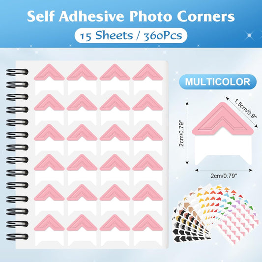 GOONAVI 15 Sheets 360 PCS Multicolor Acid-Free Photo Corners Notebook, Self-Adhesive Photo Corners for DIY Photo Album Journal, Photo Corner Stickers for Trip Journal Memory Book