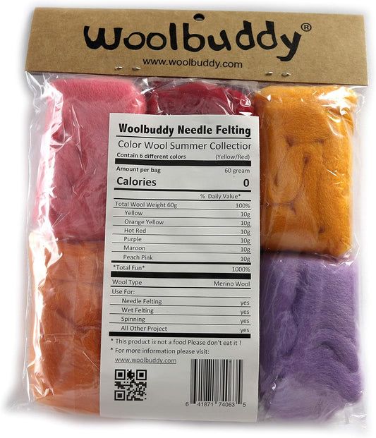 Woolbuddy Needle Felting Wool, Natural Handmade Wool Roving, 6 Vibrant Colors with Instructions (Wool Bag Summer)