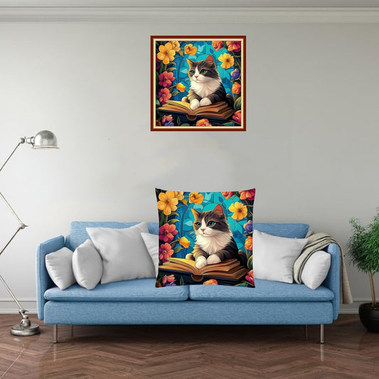 Stamped Cross Stitch Kits for Adults Beginners Pillow Needlepoint Kit with Embroidery Pattern Needlework Kit Prestamped Stitches Kit 11CT Cross Stitching-Cat Reading 18x18 inch