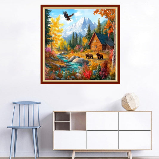 Joyhoor Cross Stitch Kits for Beginners Stamped Cross-Stitch Supplies Needlework preprint Embroidery Kits for Adults DIY Needlepoint Kits Embroidery Patterns 11CT-Brown Bear Landscape 18x18 inchs