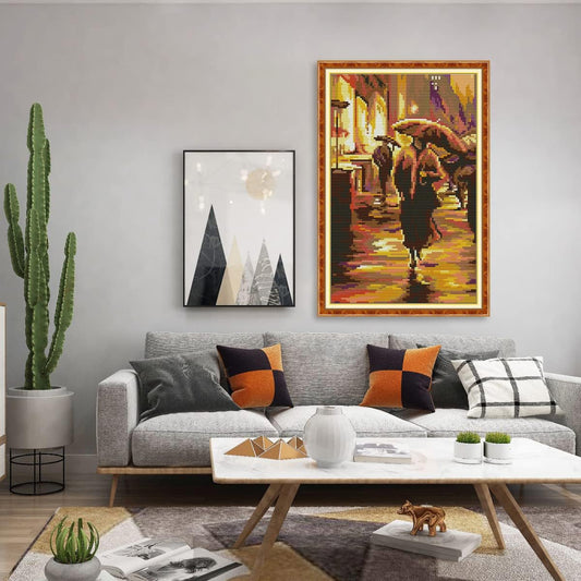 Stamped Cross Stitch Kits Beginners Full Range of Crossstitching Preprinted kits Pattern for Kids or Adults, DIY Needlepoint Embroidery Craft Kits 11CT 3 Strands-10.2×15.7 inch,Walking in the rain
